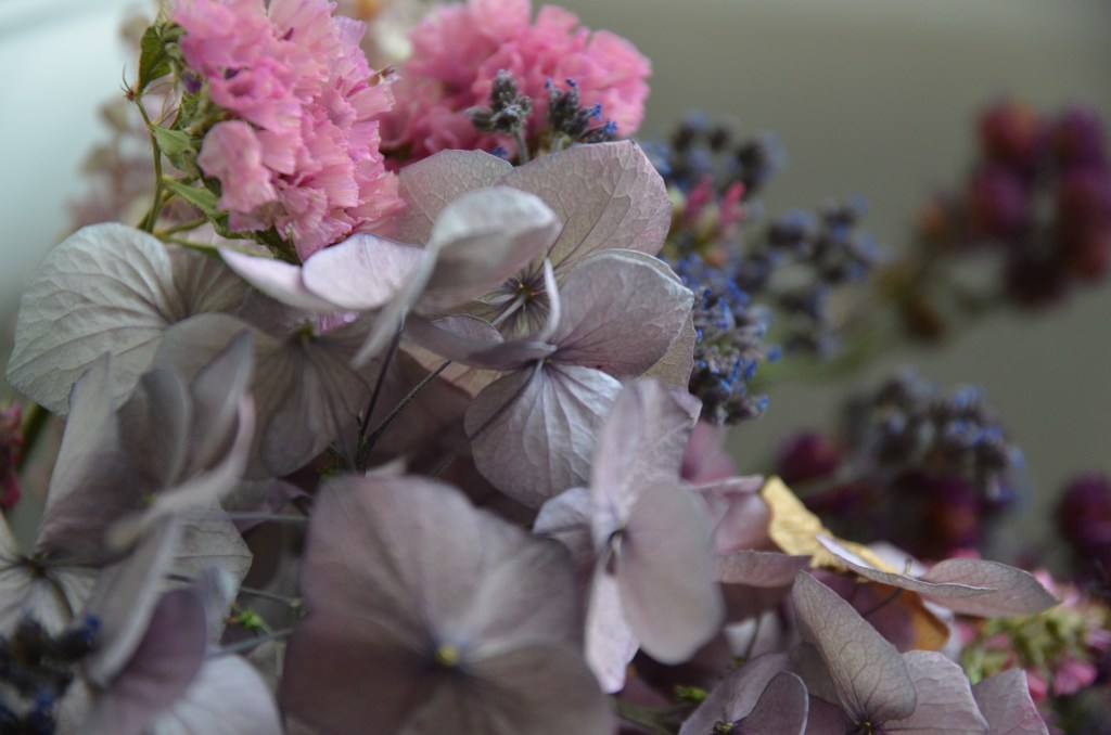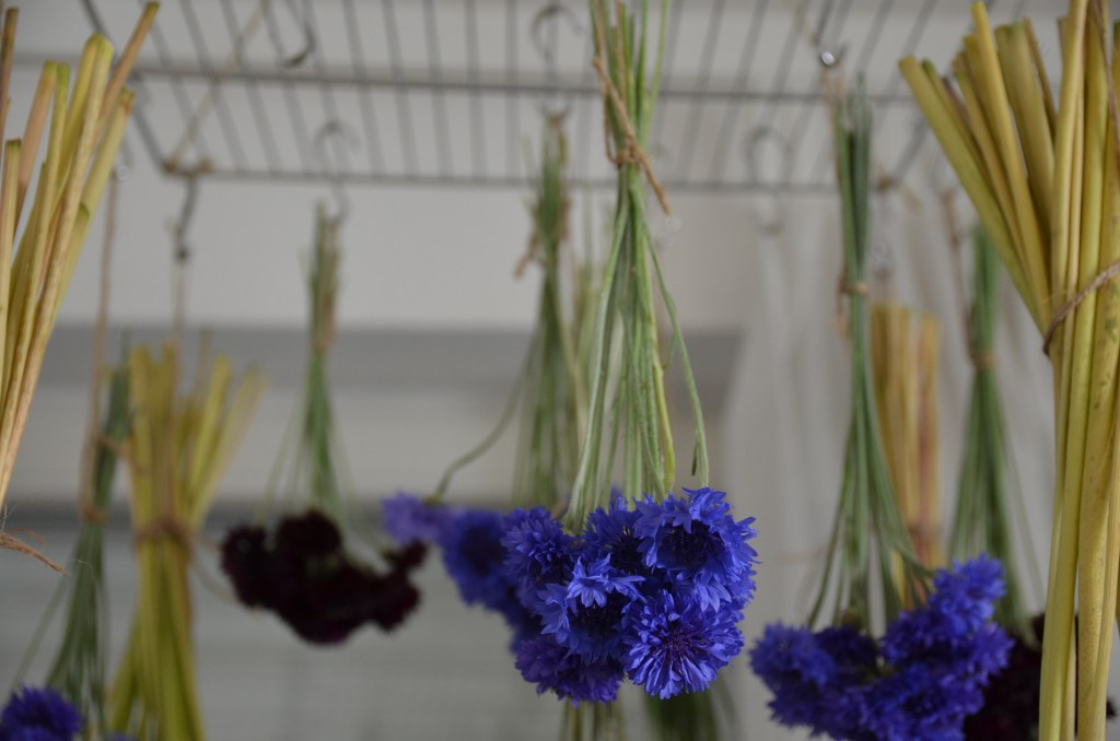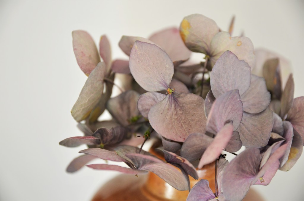 Die meisten Blumensorten trocknen nach meinen Erfahrungen am besten hängend. Einzige Ausnahme bei mir sind die Bauernhortensien, die ich mit oder auch ohne Wasser einfach in der Vase trocknen lasse. Ihre Farben verändern sich dabei zu blasseren, moody Tönen, was ich sehr edel finde.
