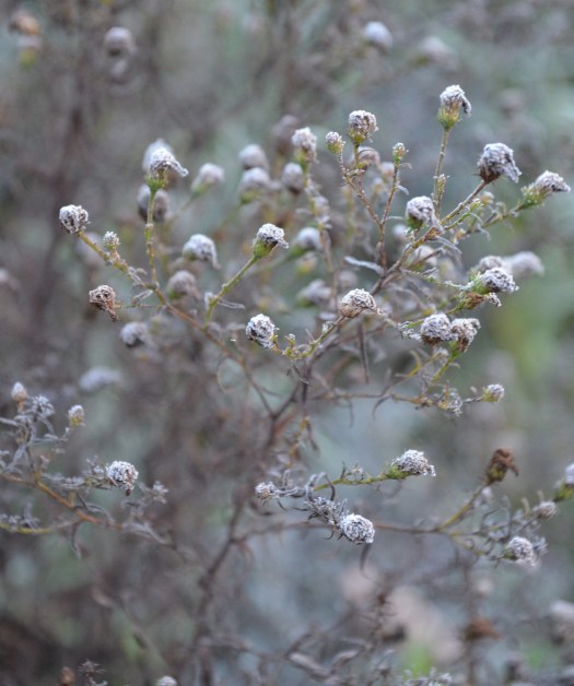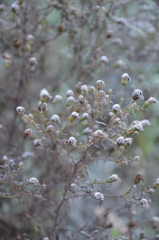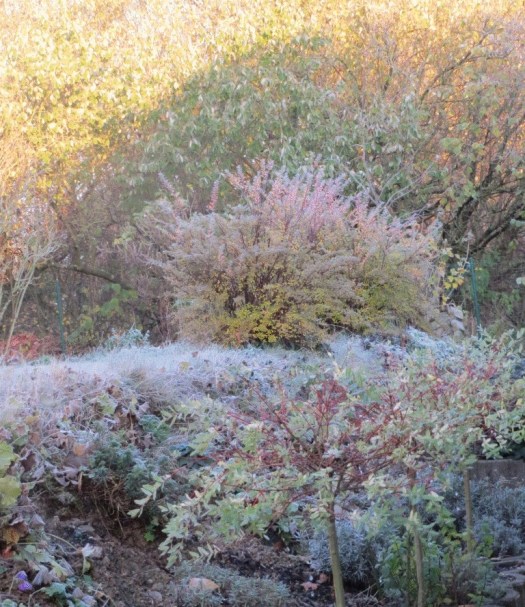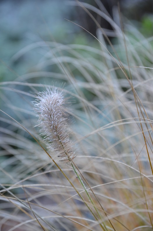 Im Garten hat die Ruhezeit begonnen. Novembernebel verwischt die Konturen, die vorherrschenden Farben sind Grau, Natur und Braun in allen Nuancen und das dunkle sanfte Grün der immergrünen Pflanzen.